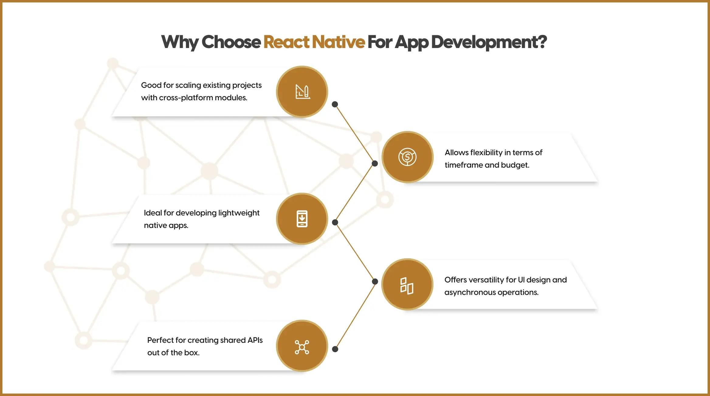Using a single JavaScript codebase, a Facebook-backed open-source platform, React Native is capable of developing powerful native mobile Apps for iOS & Android. Whether you're a startup, SMB, or a gigantic enterprise, React Native apps answer your simple and complex requirements and offer developmental features suitable for a versatile set of niches. Moreover, React Native apps offer lightning-fast performance, a native user experience, and a futuristic feel.